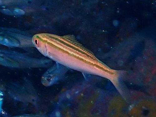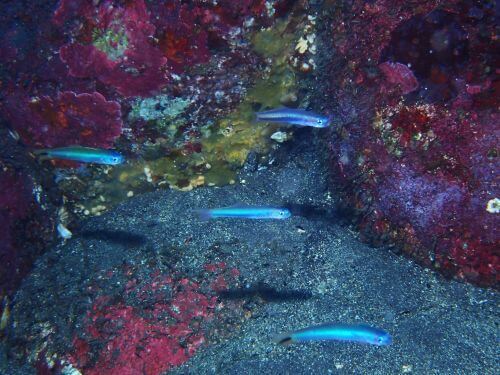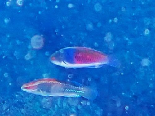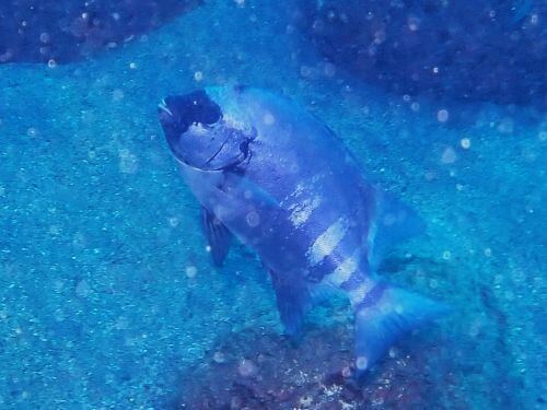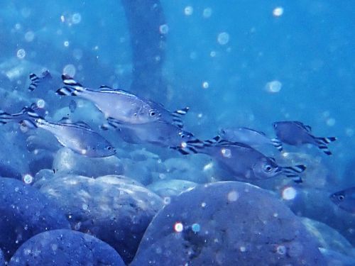 二本目には水面移動中の眼下に大量のキビナゴ、コガネキュウセンのペア、ガラスハゼ、尾ひれを開かないと、あまり特徴がないタコベラ、そして同じような大きさなのに微妙に柄が違う二匹のコショウダイなどがいた。