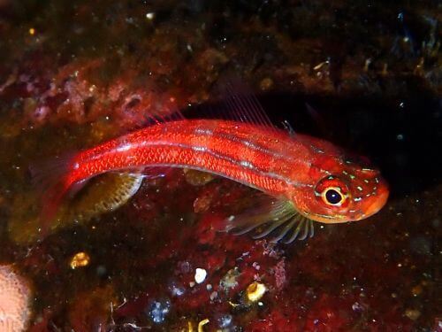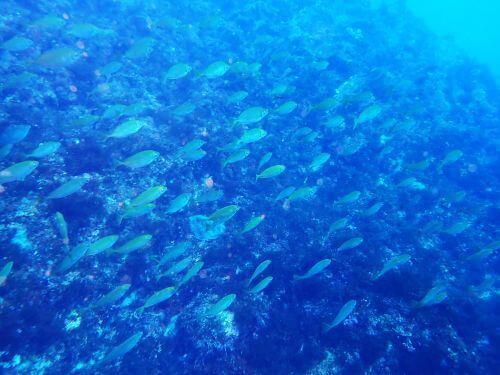 アイゴの若魚の群れ、イソギンチャクの根の上にはミツボシクロスズメダイの幼魚、岩をじっくり見ていくとタテジマヘビギンポ、浅瀬には3cmほどの、まるで海藻の切れ端の様なブチススキベラの幼魚。
