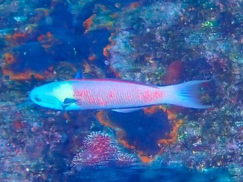 目を引いたのが、緑と黄色とピンクの様な色のコガシラベラのオス。