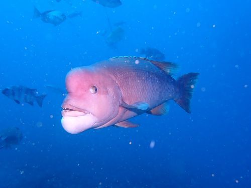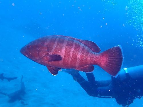 サメ以外にも、メーター級のクエ、コブダイ、アカエイ、テングダイ、ヒゲダイ、カスザメ、マハタ等々。