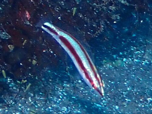 中を覗くと、モンツキベラの幼魚が泳ぎ、岩の下に、なにかベニハゼのようなものがいる。