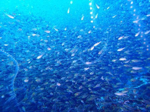 大物たちを堪能した後、根の周りを泳ぎ始めると、前が見えなくなるほどのキンメモドキの群れがいた。