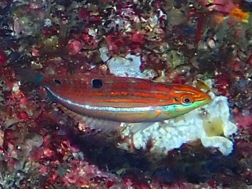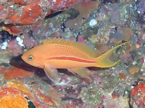 亀裂の中には赤いラインが鮮やかなスジハナダイの姿も。