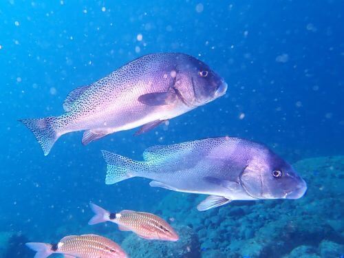 中層にはイサキやスズメダイの群れ、