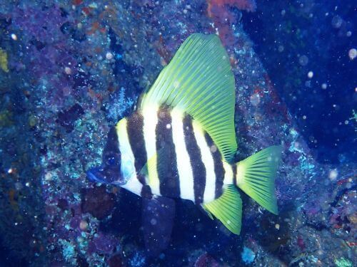タカノハダイが固まっているエリアがあり、キューブの上に一列に並んでいた。