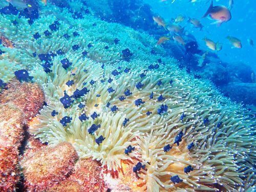 2mはありそうな大きなイソギンチャクに大量に群れるミツボシクロスズメダイなどが見られた。