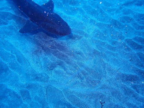潜降ロープを下っていくと、中層にはメジナが群れ、眼下にはドチザメが水底を泳ぎ周っている。
