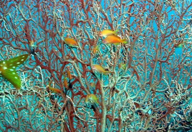 のんびりとした雰囲気の陸上から水中に入ると、そこは赤や紫、黄色といったソフトコーラル。