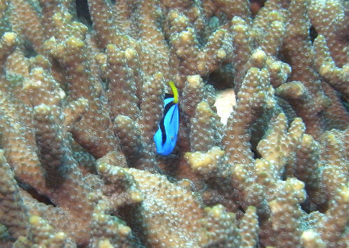 深いサンゴの隙間をかくれんぼをするように動いている、鮮やかな濃いブルーが印象的なナンヨウハギの幼魚。