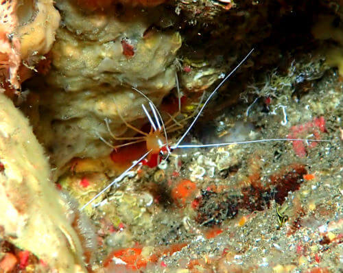 背中の真っ赤なラインが目立つアカシマシラヒゲエビ、