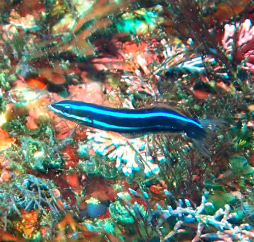 今まで何度もミギマキの幼魚も見ているけど、全て成魚と同じ黒と黄色のストライプだった。