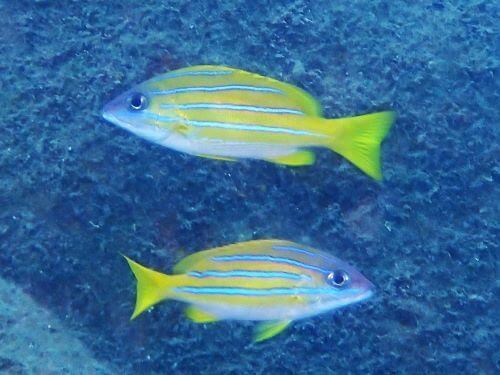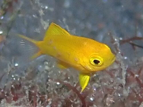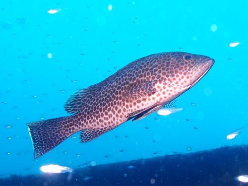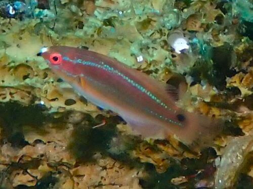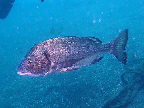 途中にはタテシマフエフキ、コロダイ、新漁礁に着くと、数十のアカオビハナダイが群れ、数百のスカシテンジクダイ、その周りにはハタタテダイ、オオモンハタ、イシガキダイ、イシダイ、漁礁を覗くと何匹ものユカタハタやナミマツカサがいた。