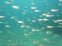 この日見られた生物達は、エントリー口にオヤビッチャ、ソラスズメダイ、時折ボラの大群。