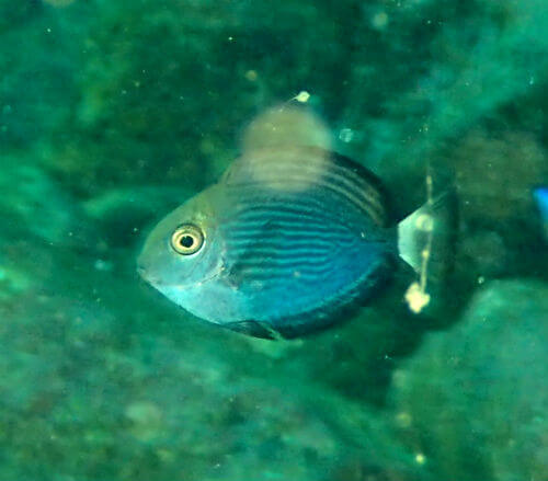 ニザダイ科成魚に比べ、体が丸く特徴である尾ひれの前の3本線が、まだない2019/5/27撮影