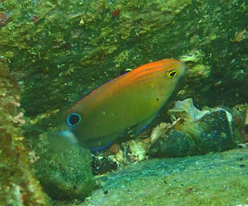 ハタ科定番種ながら江之浦には少なめ鮮やかなオレンジの体色に目の紫が美しい魚2018/12/1撮影
