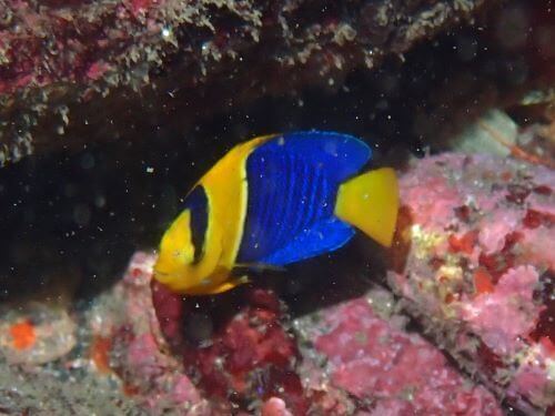 キンチャクダイ科成魚になると黄色地にブルーのラインというカラーになる2018/9/25撮影