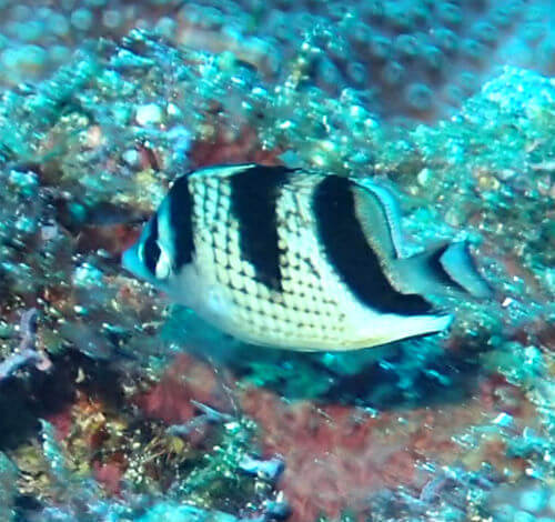 チョウチョウウオ科ムレハタタテダイとほとんど同じ外見尾ひれ前の黒い線の始まりが後ろの方にあるのが本種ポイント:局長の浜2019/7/20撮影