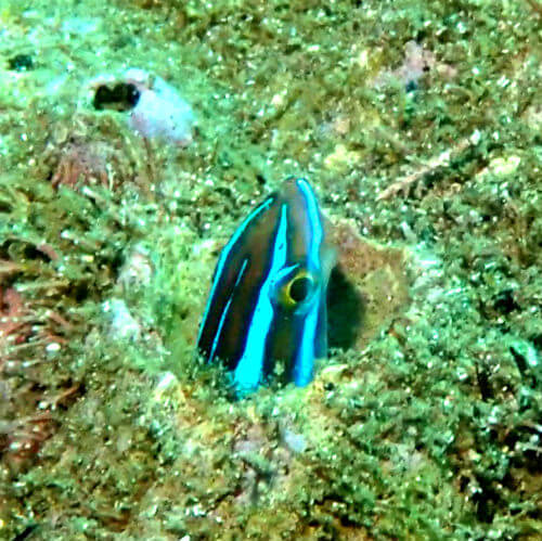 キンチャクダイ科季節来遊魚水深1m桟橋の割れ目にいた2018/10/27撮影